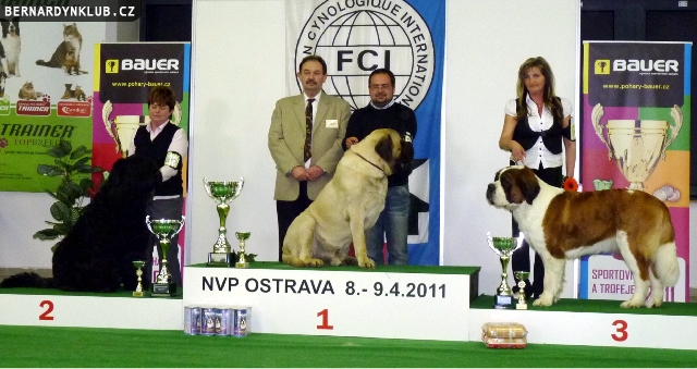 Národní výstavy psů v Ostravě se v neděli 10. dubna 2011 zúčastnilo pouze 6 svatobernardských psů dlouhosrstých. Naše plemeno posuzovala paní Božena Ovesná, která za vítěze plemene vybrala Ch. Agátu od Strážců hor. Agátě se dařilo také v závěrečných soutěžích, když se umístila na 3. místě ve 2. FCI skupině.