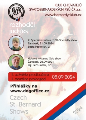 Vážení příznivci bernardýnů, dovoluji si Vás jménem Klubu chovatelů svatobernardských psů ČR z.s. pozvat na dvě výstavy, které se uskuteční během jednoho víkendu 21.-22. září 2024 v kempu v Žamberku. Je to akce, během které se sejde na jednom místě v jeden termín pohromadě největší počet bernardýnů. Důvodem není jenom výstava a předvedení svého bernardýna v celé své kráse, ale také setkání lidí, které spojuje společný koníček. Tím koníčkem je naše krásné plemeno. Přímo v areálu výstavy je možné se ubytovat v chatkách či penzionu i se psy, na místě je také restaurace. Pro vítěze máme krásné ceny, ale dárek na památku čeká na úplně každého majitele přihlášeného bernardýna. Kromě klasických tříd máme otevřené i velmi oblíbené soutěže jako je Dítě a pes nebo Mladý vystavovatel.